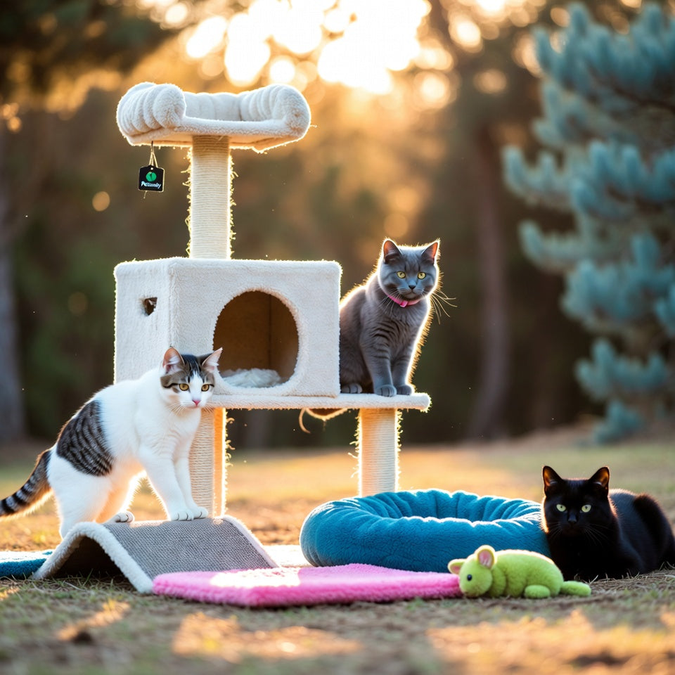 • Ein stabiler Kratzbaum & buntes Katzenspielzeug aus Filz zur Selbstbeschäftigung in der Wohnung.