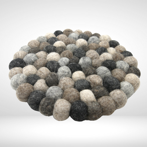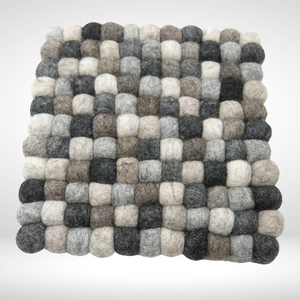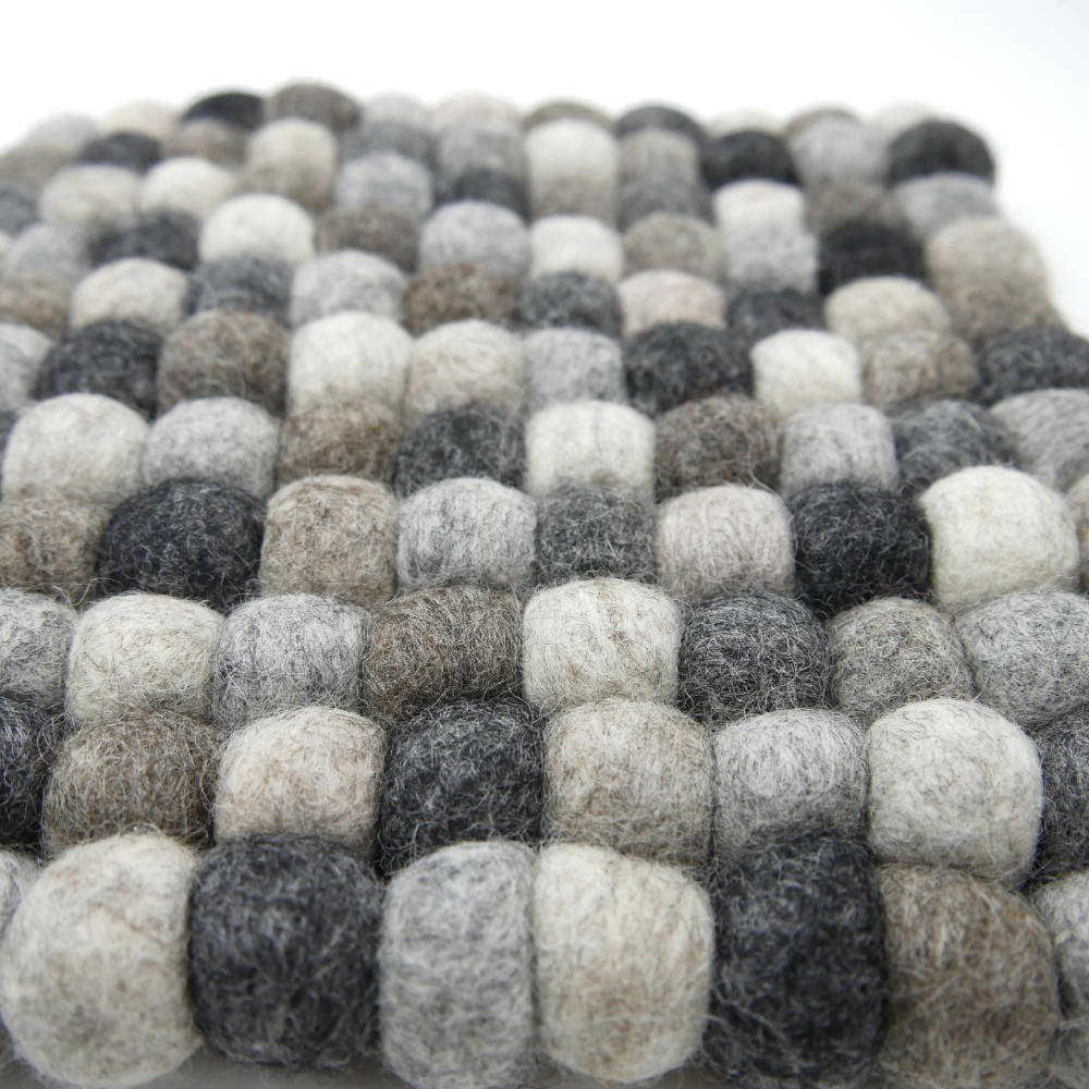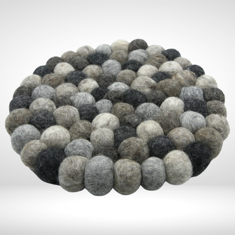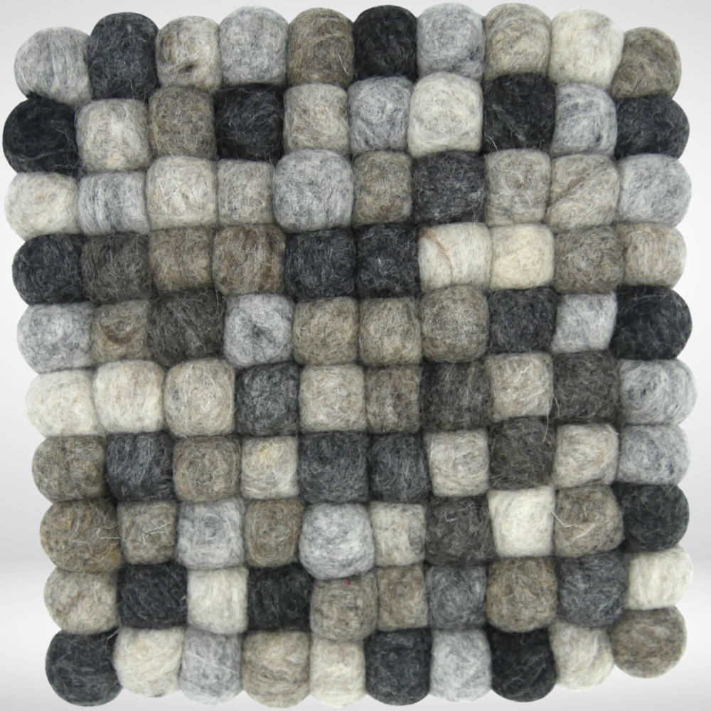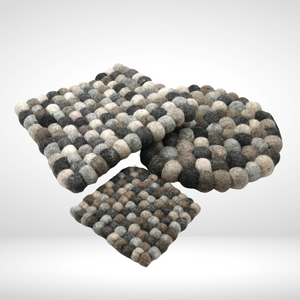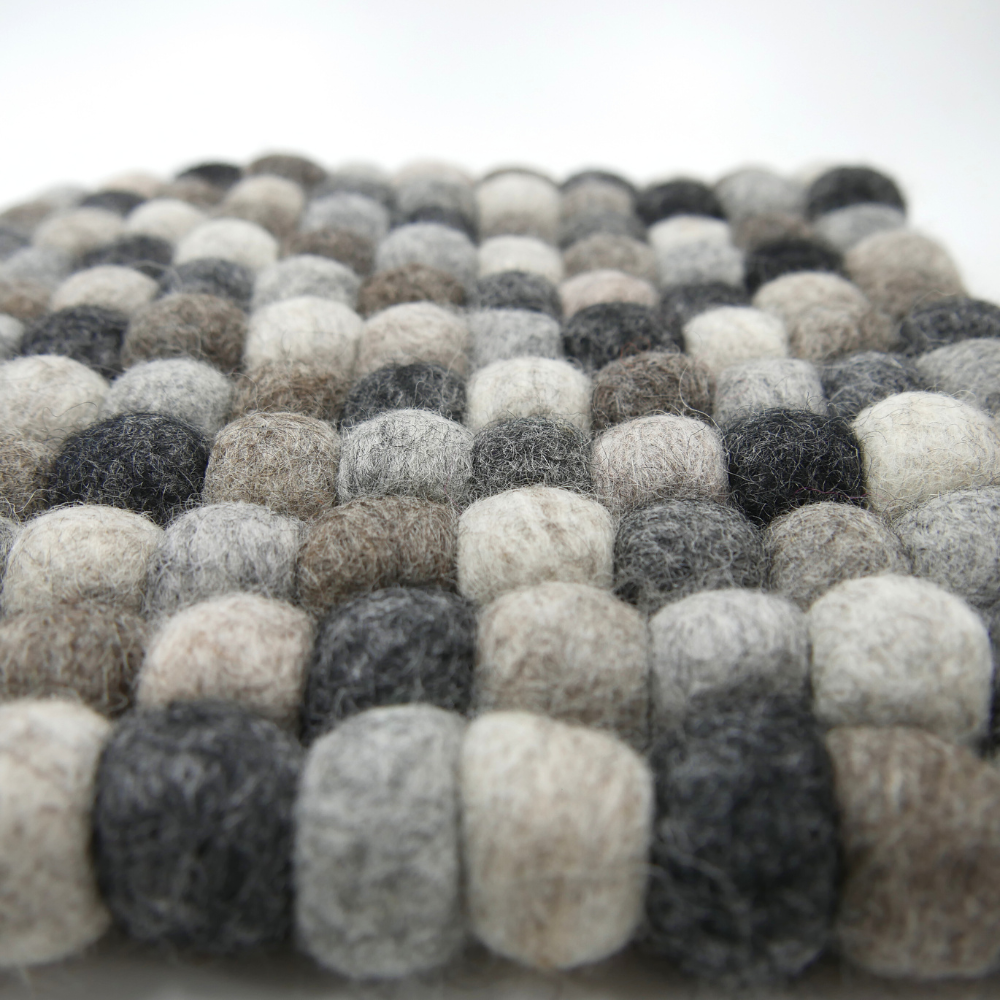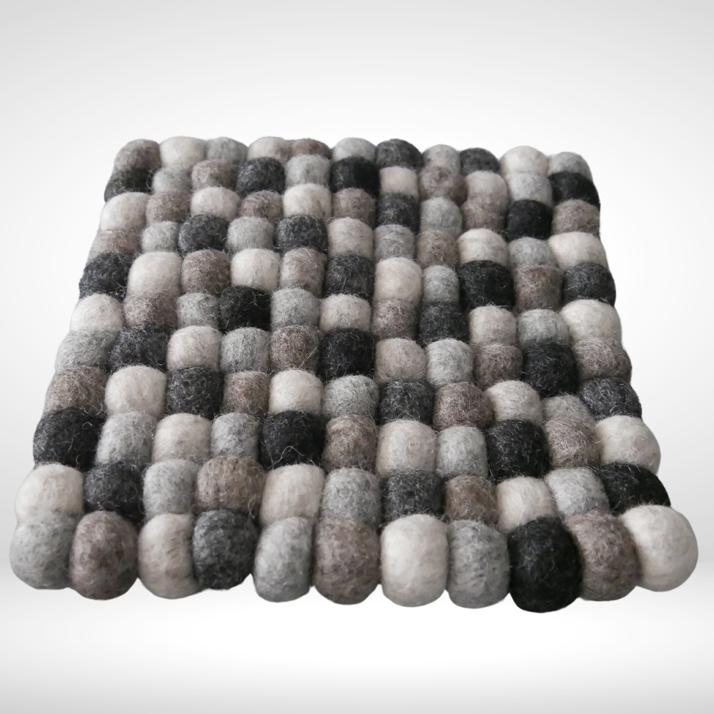 Eckig: Rechteckige Untersetzer aus fein arrangierten Wollkugeln in natürlichen Grautönen – perfekt für minimalistische und skandinavische Wohnstile. Setzen Sie elegante Akzente auf Ihrem Tisch!